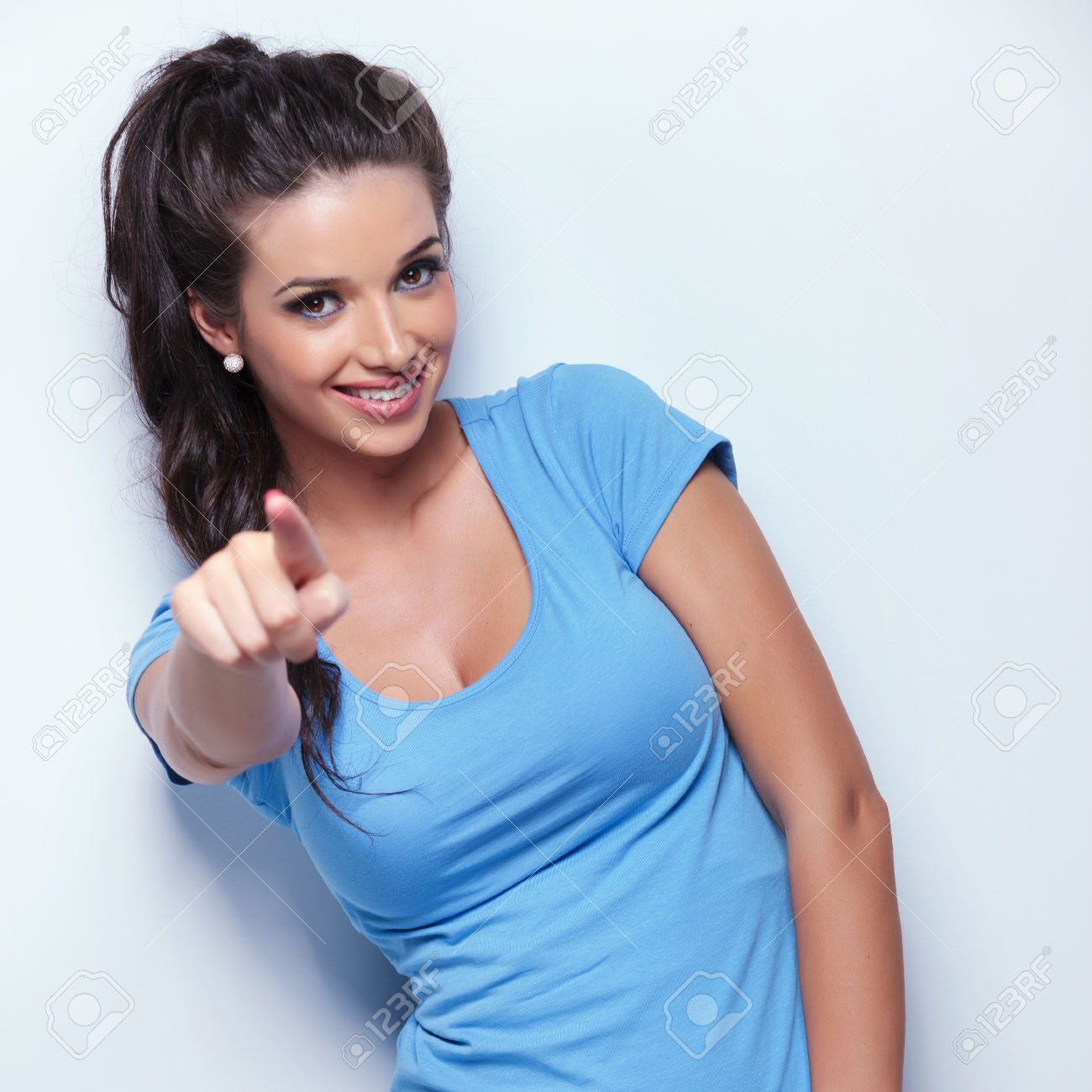 casual woman smiling and pointing her finger